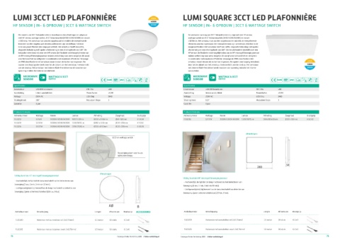 De ronde Lumi 3CCT led plafonnière is leverbaar in drie afmetingen en uitgerust De vierkante Lumi square 3CCT led plafonniere is uitgerust met HF sensor,